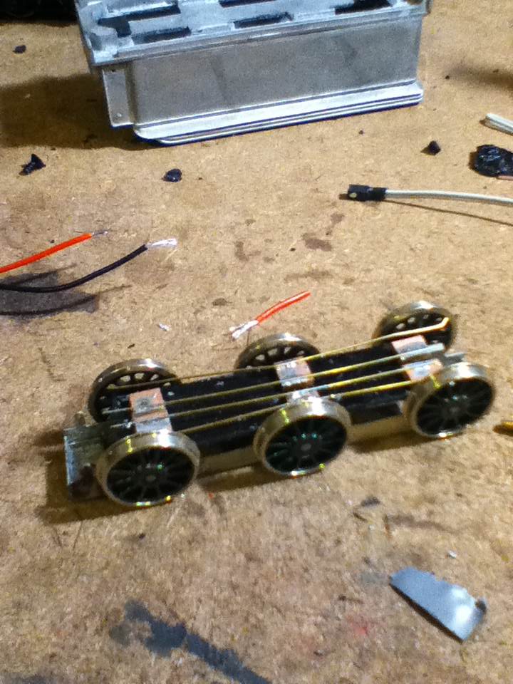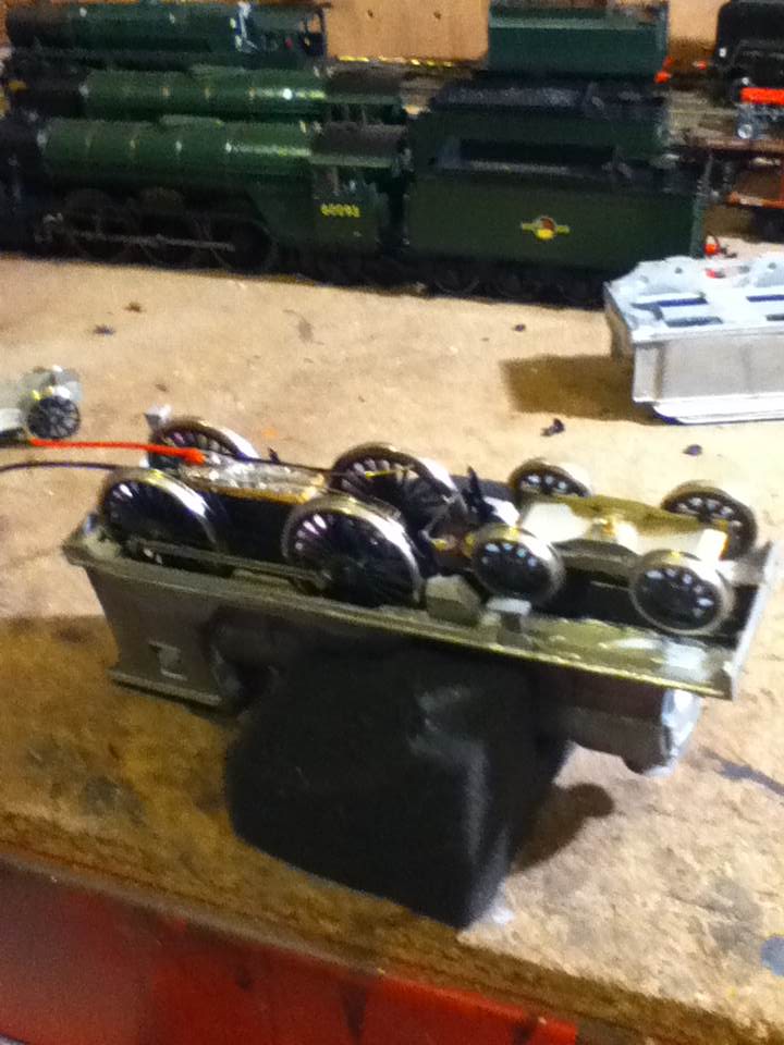 A basic pick-up rig was created for the tender with pick up on the aft four wheels and a pair of bus bars connecting these with the front of the tender. The connection has been tested then separated again after being found to function correctly. I will connect the loco and tender permanently when detailing and painting has been completed but this is now essentially a working loco.