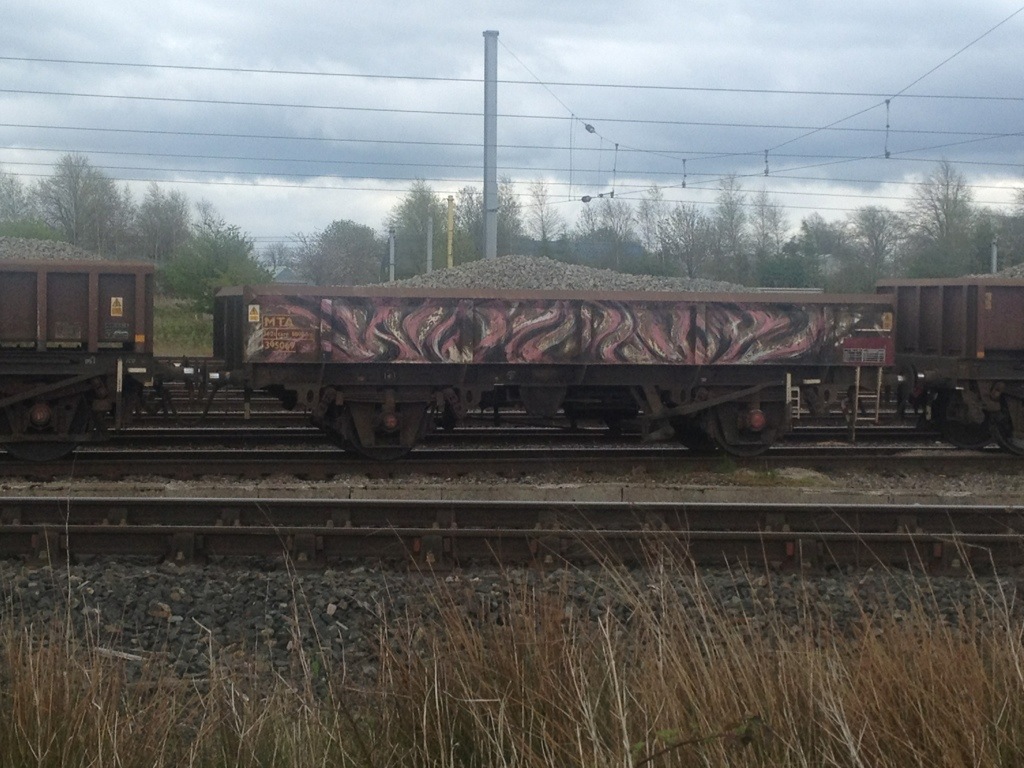 During the course of my work I regularly get railside and today whilst in Kingmoor Yard I noticed this strikingly graffitied wagon in a consist of spoil wagons and vans.
