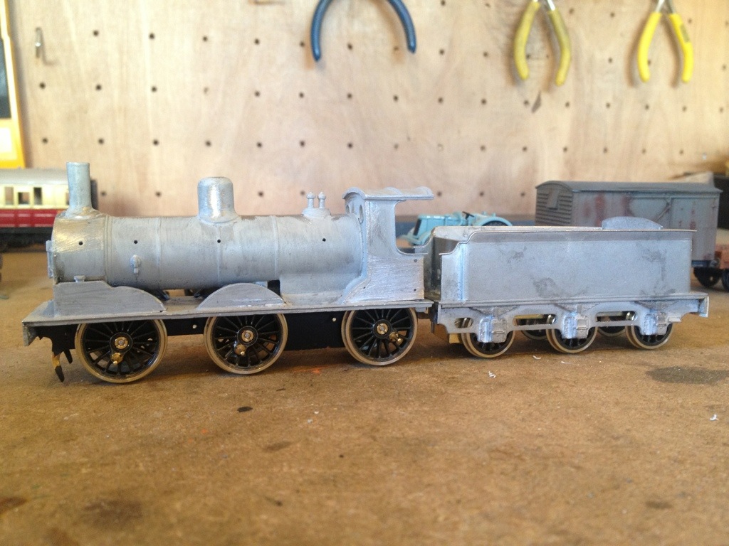 Feeling pleased that I’d pulled off the bodge successfully, I placed the wheelsets into the tender frames and have placed them temporarily under the body. There is still a bit of filing and clearance to be done underneath so the wheels turn freely and in truth I wish I’d fabricated new outer frames but things are pretty much on course now here to create a very nice little engine. I’m looking forward to adding the smaller parts and getting on with the painting.