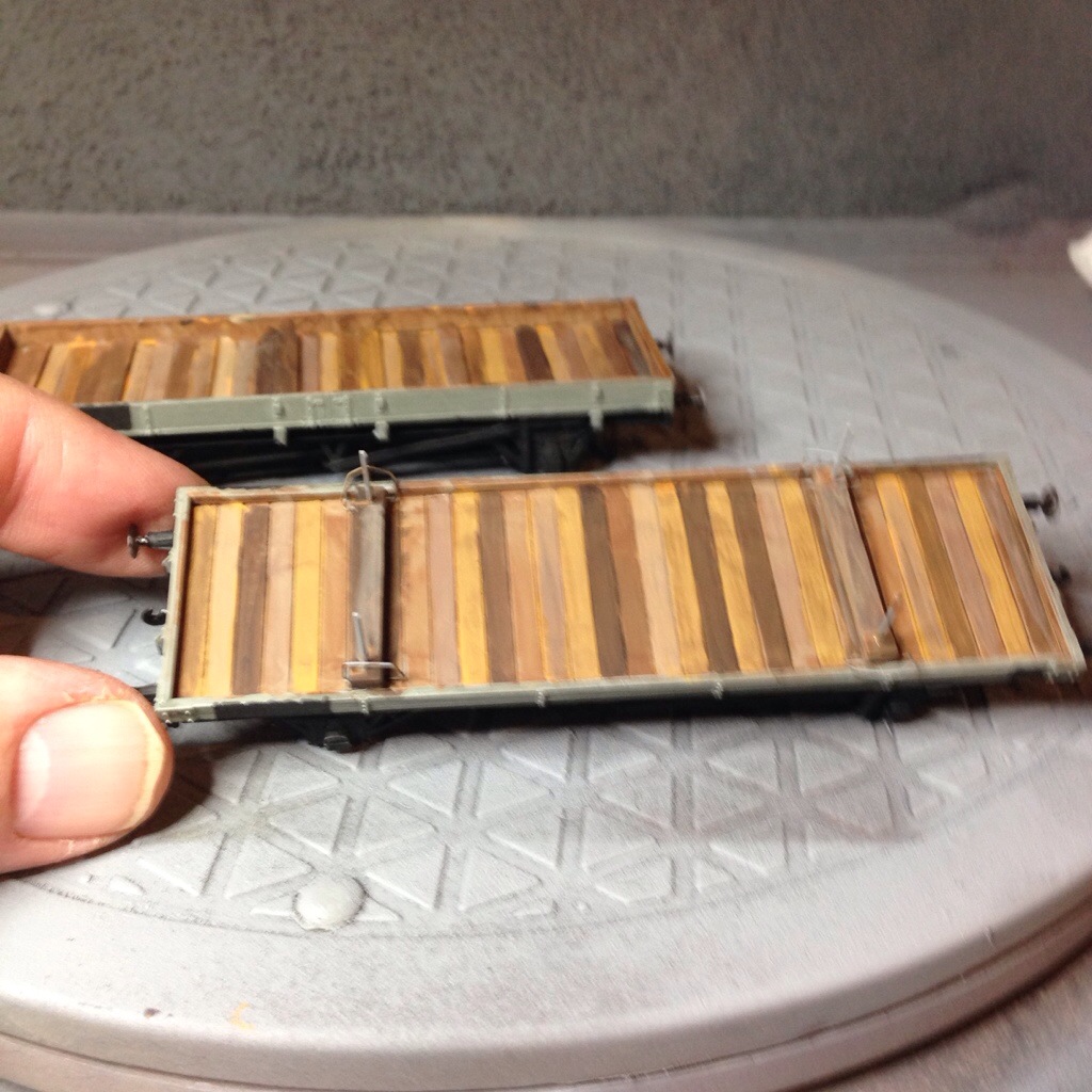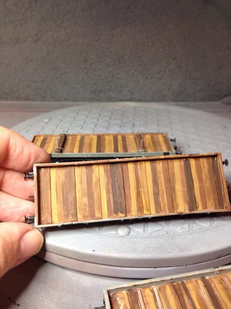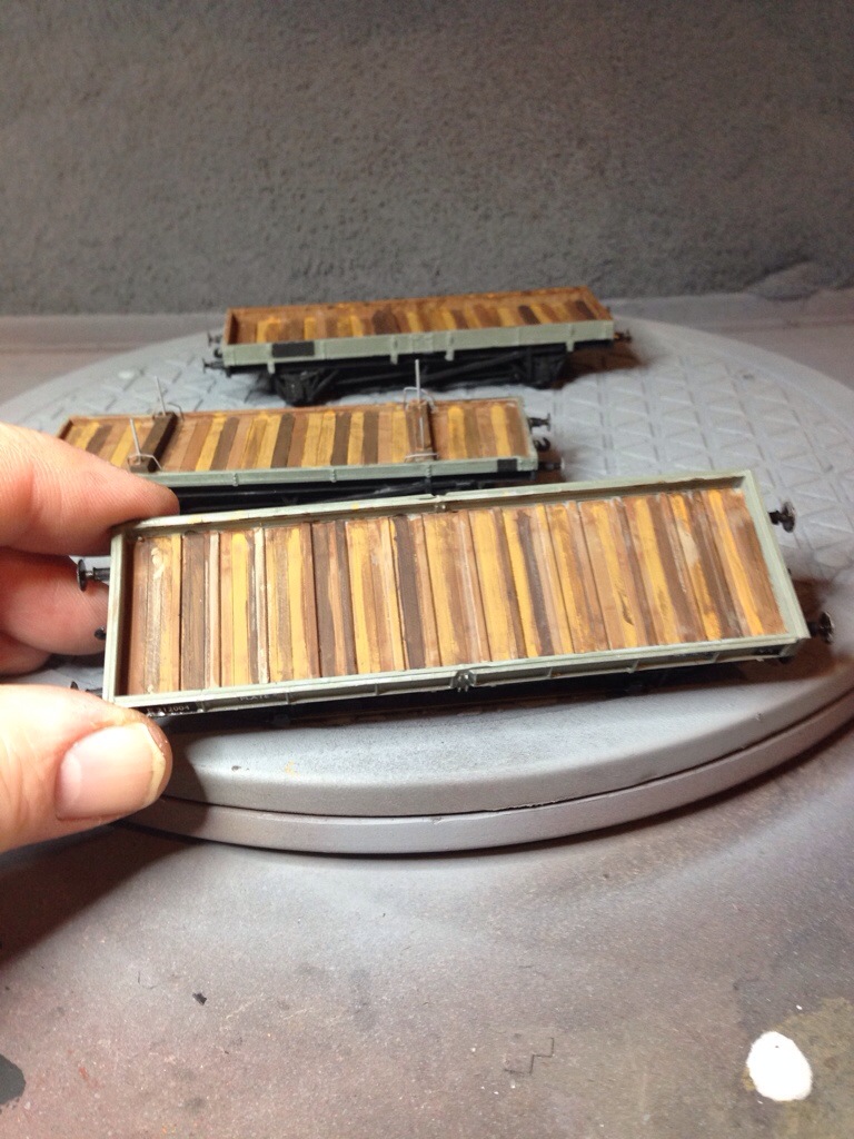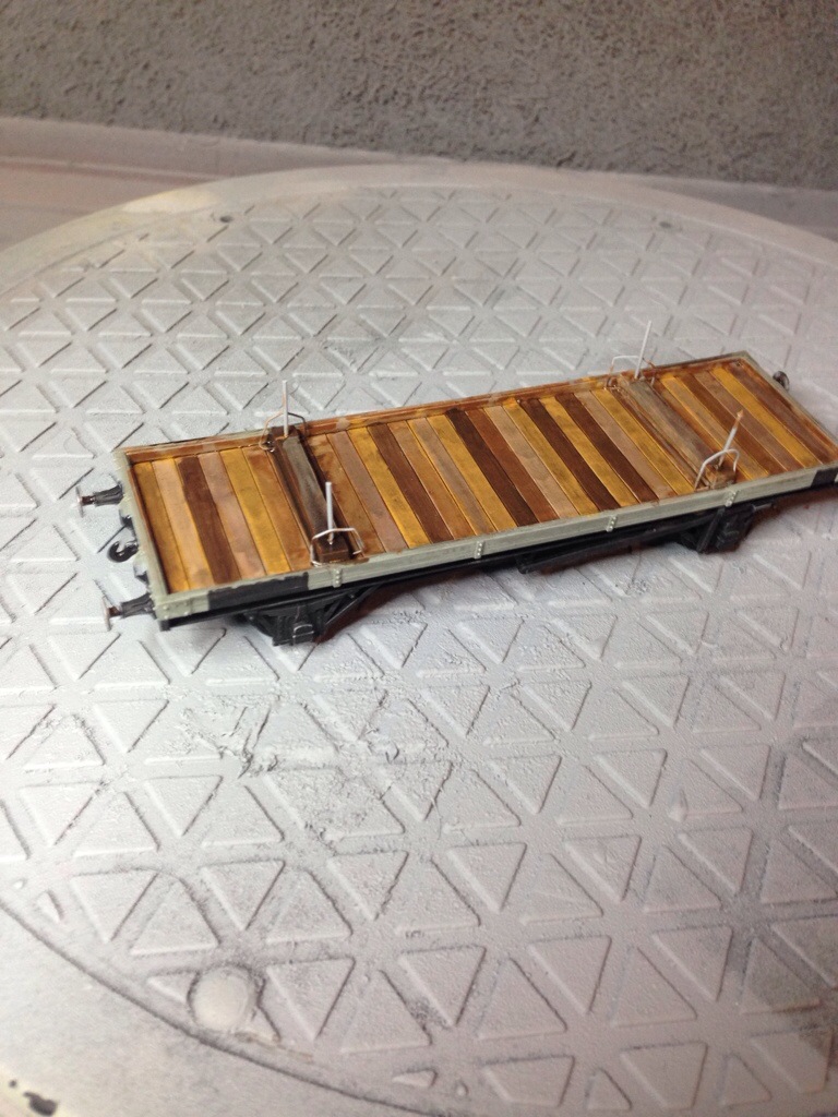 I’ve also started to work on the timber effect for the wagon deck. My technique for this involves hand brushed acrylic to a method pretty identical to that outlined in the Fifteen Minute Heroes section of Paul Marshall Potter’s Bawdsey/Albion Yard blog.