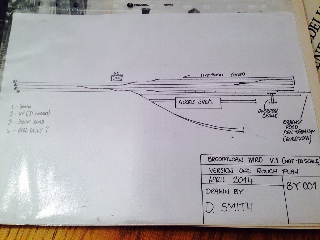 After a few ‘roughies’ I drew up this not-to-scale to provide a basic configuration that can be evaluated and developed as observations require. Already it’s been pointed out (thanks, Ian) that I will actually need two roads ‘under the wire’ as running round returned wagons might otherwise present a somewhat obvious (in hindsight!) problem for the shipyard loco.