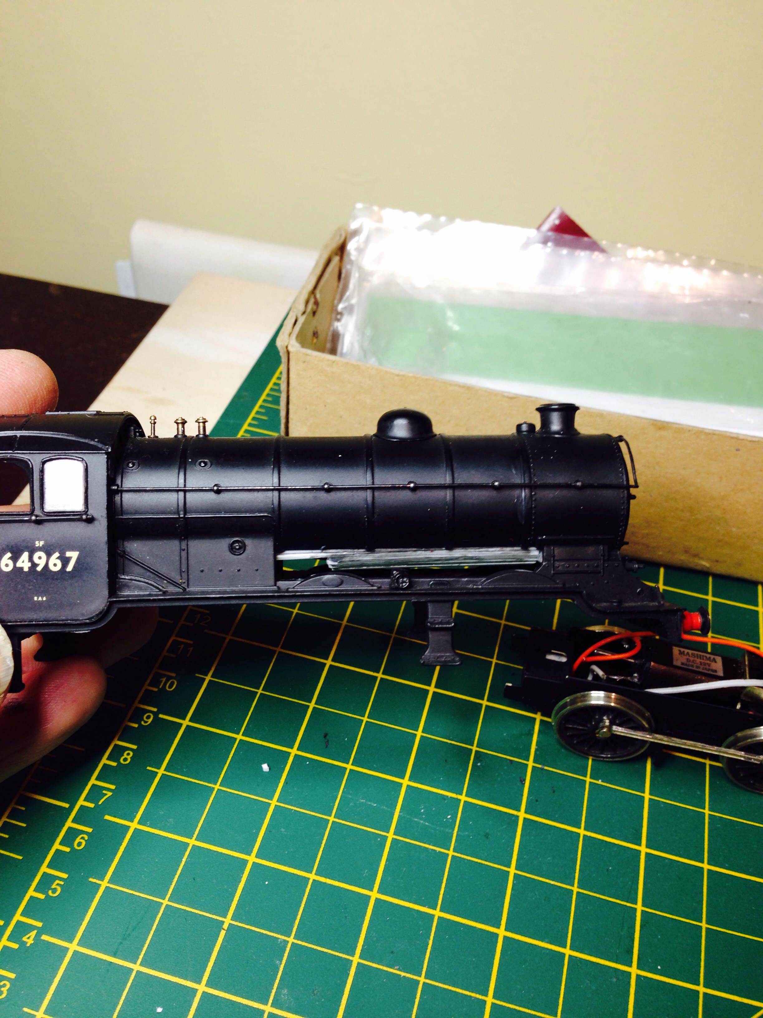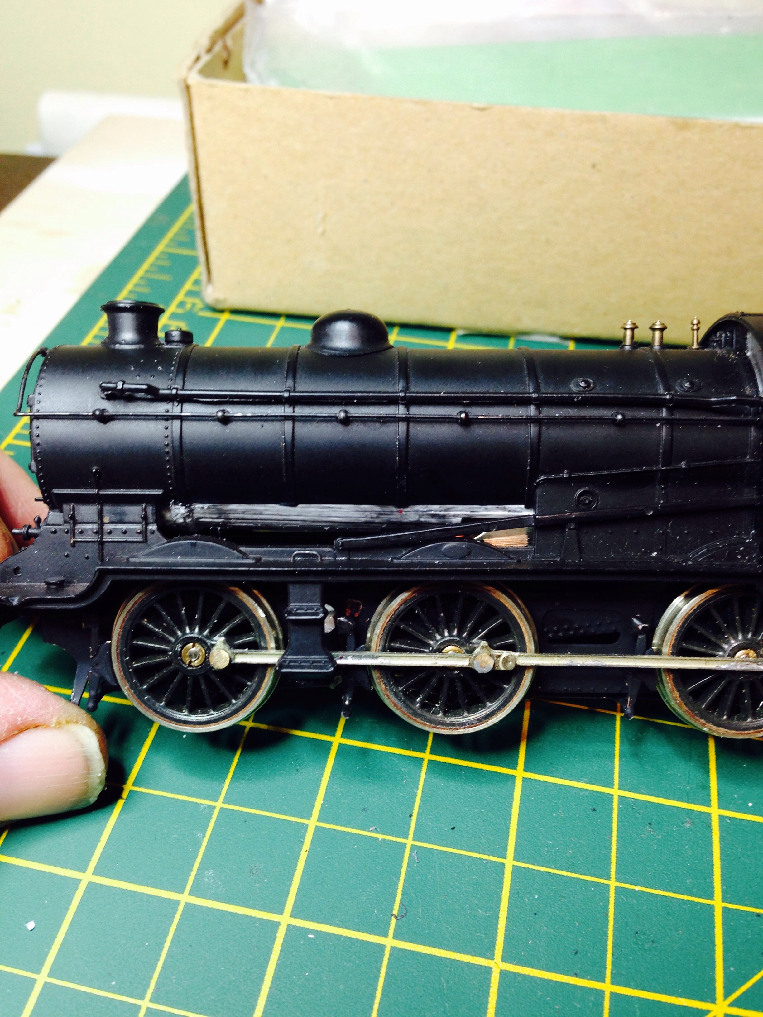 Some light modelling tonight as I turn my attention to the aesthetic side of my J39 project. You’ll remember the sizeable gap that existed under the boiler, something that was necessitated by the old split frame chassis under the Bachmann model. I remedied this by cutting a piece of 30 thou Plasticard and shaping it by dunking it in boiling water then shaping it round a piece of brass tube of suitable diameter. I then attached this to the inside of the boiler using Plastic Weld. Once this was done I then cut lengths of Microstrip which as you can see I’ve applied over the initial plasticard insert. This has built the diameter of the boiler out to more or less where it should be. Tomorrow I’ll set about sanding and filling to smooth things out and hopefully eliminate any trace of a join.