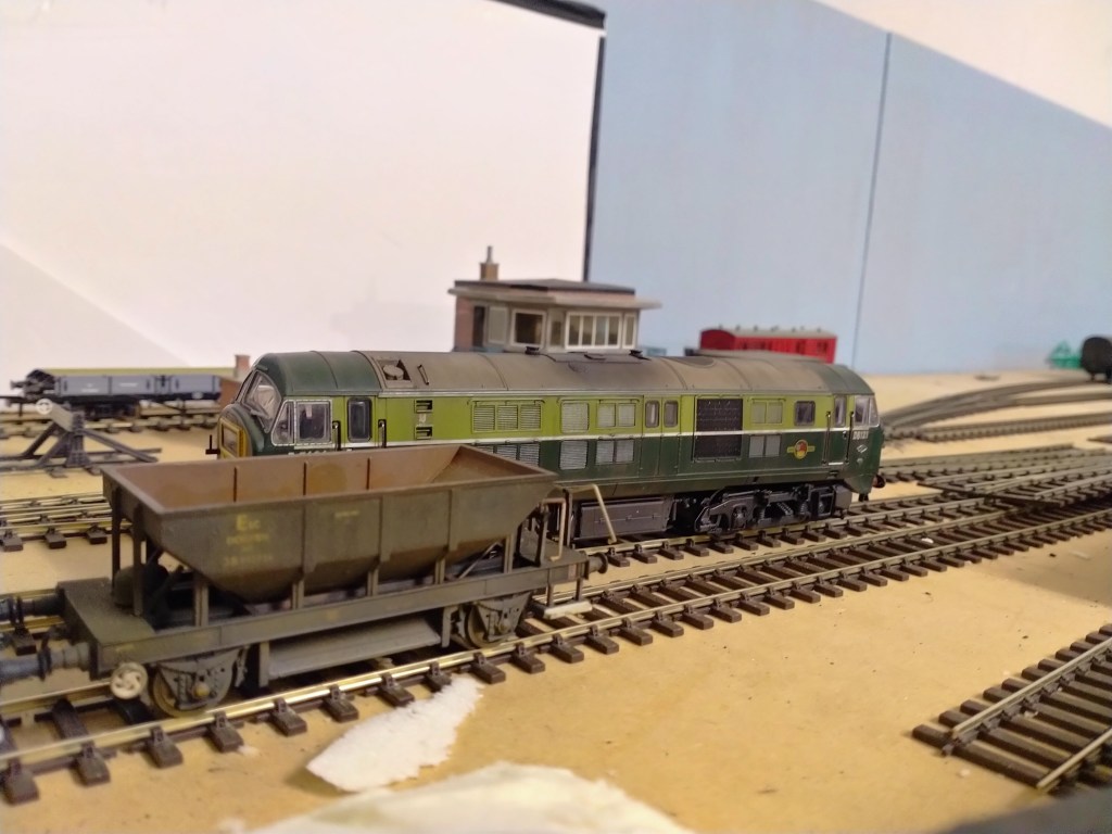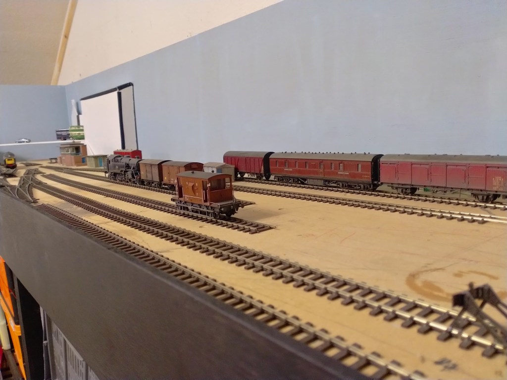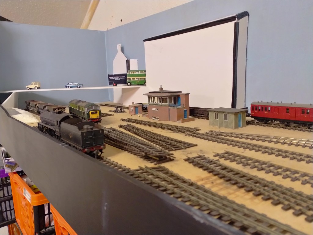 The final task tonight was to apply some pale blue paint to the back boards and then had a play about with some rolling stock and scenic items. It’s probably better to let the pictures do the talking now, but it all looks a bit ‘1966’…